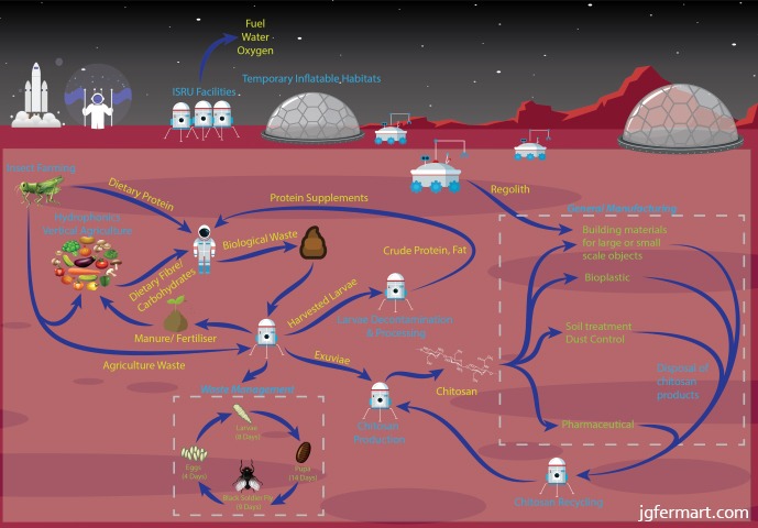 One of our recent studies uses simple chemistry, suitable for early Martian settlement, to extract and manufacture a new material with minimal energy requirements and without specialized equipment. We made this material by combining chitosan with a mineral designed to mimic the properties of Martian soil. We then used the chitinous material to construct a wrench and a model of a Martian habitat, demonstrating that this material enables the rapid manufacturing of objects ranging from basic tools to perhaps even rigid shelters, which could support humans in a Martian environment. This approach may be the key to our development as an interplanetary species.