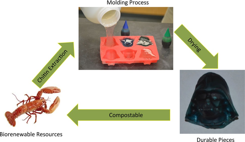It is a multiple day activity for students to create large-scale plastic objects made of chitin. The plastic objects created are durable and made from benign materials, making them suitable for students to take home to play with. Since the student-created plastic objects are sourced from biomass and fully compostable, the activity provides an opportunity to discuss depleting petrochemical resources and biorenewable feedstocks as well as issues of biodegradation vs persistence.