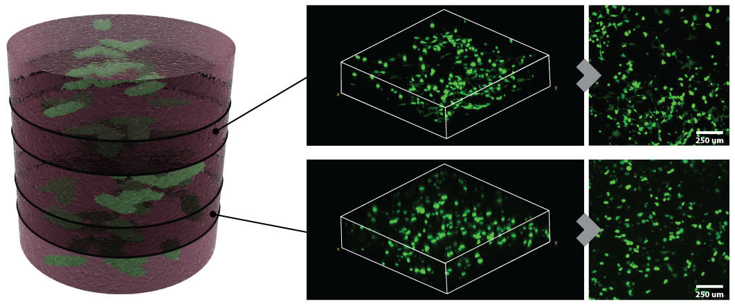 CNF hydrogel is made of cellulose, the most abundant organic polymer on Earth and comprises 99% cell media. This enables cells to live and grow, making it a suitable medium as a carrier for healthy tissue and cells. Additionally, since CNF hydrogel’s transition from a solid hydrogel to liquid is enabled by absorbing the stress, that stress is not transmitted to the cells, effectively allowing them to survive the transition process and ensure high cell mortality during delivery.