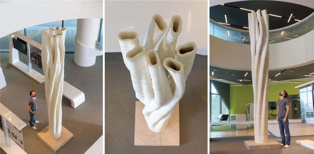 To demonstrate the capability of FLAM to compite -and in many senses surpass- the current paradigm of manufacture with synthetic polymers, we produced  the largest 3D-printed object in Singapore, and the world’s largest biological object ever printed. It is 5 metres tall, with a diameter of 0.5-metre at the base and 1-metre at the top (named Hydra) and is made entirely of FLAM. It weighs 100kg and took about 50 hours to 3D print it. Being made of the two most ubiquitous organic polymers on Earth, the Hydra can be produced -and degraded- anywhere using local natural resources, without the need to ship materials to build it, or to recover and use special facilities to compost it… No tricks, no “but”, no side notes; the technology behind the Hydra is not based on PLA or any other polyester usually claimed as biodegradable -but requiring recovery and specialized facilities-. Hydra if fully biological, making use only unmodified biological molecules that are perfectly integrated in the ecological cycles of Earth, without the need of recovery, treatment, or any other type of human intervention. FLAM is the first technology fully independent of plastic which can compete with it in terms of cost and versatility.